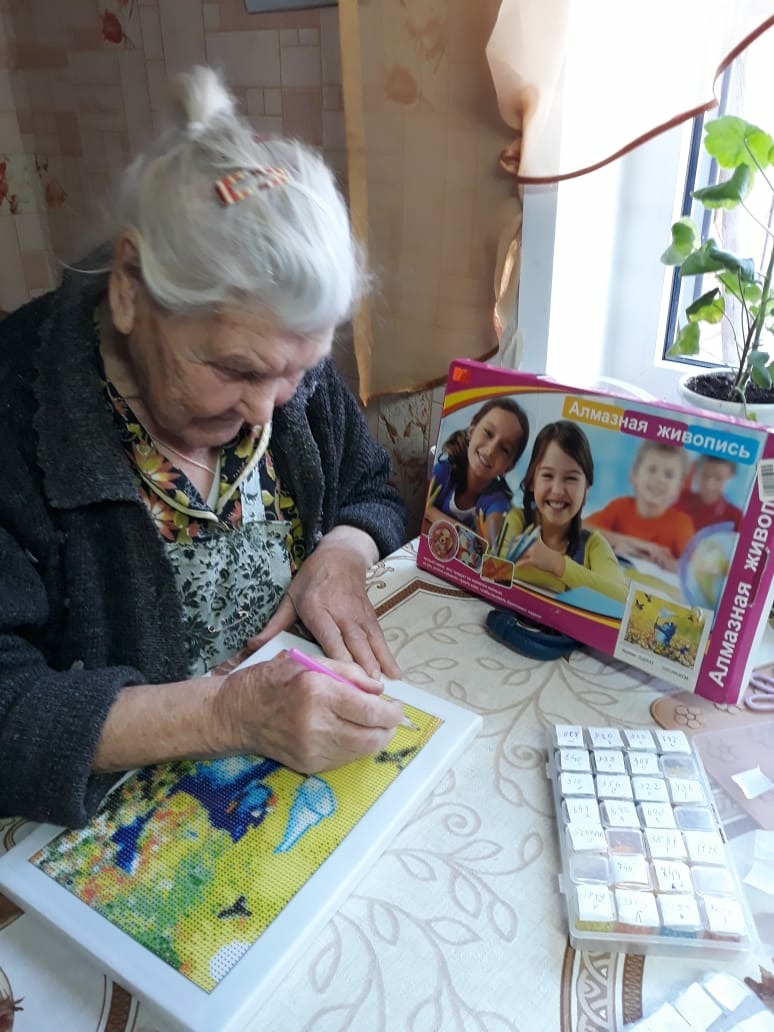 Давно известно, что занятие любимым делом поднимает настроение, отвлекает от повседневных проблем и благотворно влияет на здоровье. Мы всегда очень радуемся за наших подопечных, когда они находят для себя занятие по душе. Получательница социальных услуг нашего Центра, ветеран Великой Отечественной войны Сычева Любовь Семеновна с недавних пор занимается алмазной живописью. Она с удовольствием выкладывает узоры, создавая очень красивые картины. Новое хобби доставляет ей огромное количество позитивных эмоций и наполняет энергией. Картины, созданные с особым настроением, получаются очень выразительными и яркими, сверкают блеском алмазных граней и радуют глаз хозяйки и ее гостей. Желаем нашей подопечной дальнейшего творческого вдохновения и новых ярких работ!