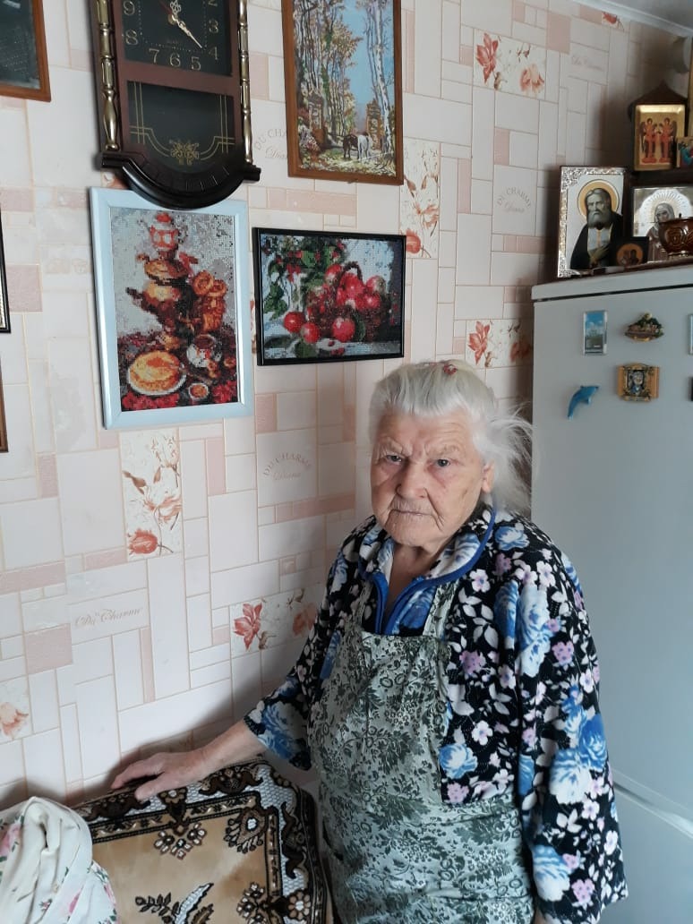 На фото: получательница социальных услуг нашего Центра, ветеран Великой Отечественной войны Сычева Любовь Семеновна за любимым занятием и на фоне готовых работ.