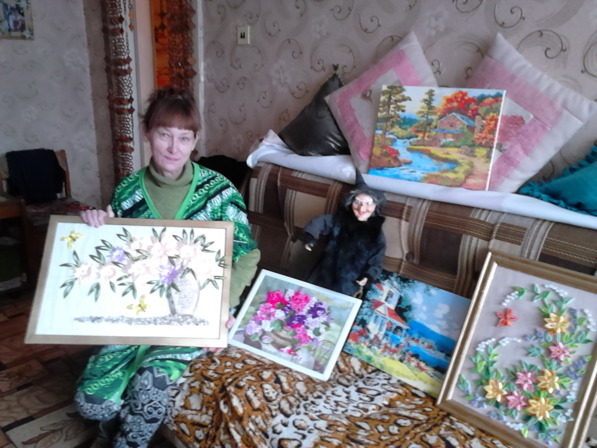 В Управлении «Коломна» на обслуживании состоит Лукичева Елена Анатольевна – очень творческая личность. С детства у нее была тяга рисовать, шить, вязать. Но так сложилась жизнь, что профессию она выбрала не творческую, после школы пошла учиться в технический вуз. Затем начала работать, заочно закончила экономический институт. Жизнь была нелегкой, Елена Анатольевна много трудилась, одна растила сына. Случилось так, что заниматься творчеством у нее появилось время только после тяжелой болезни. Немного оправившись после операции, получив группу инвалидности, наша подопечная не опустила руки - пыталась что-то сшить, связать. Потом увлеклась мозаичными картинами, дальше начала рисовать, делать панно, вышивать крестом, бисером, лентами. Сейчас произведений, созданных своими руками, уже очень много, ее квартира стала похожа на музей, некоторые работы она дарит знакомым и близким на память. Желаем Елене Анатольевне дальнейшего вдохновения и новых ярких работ!
