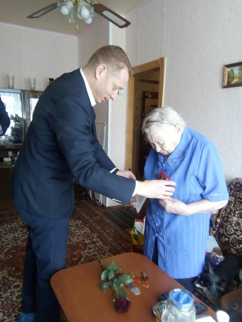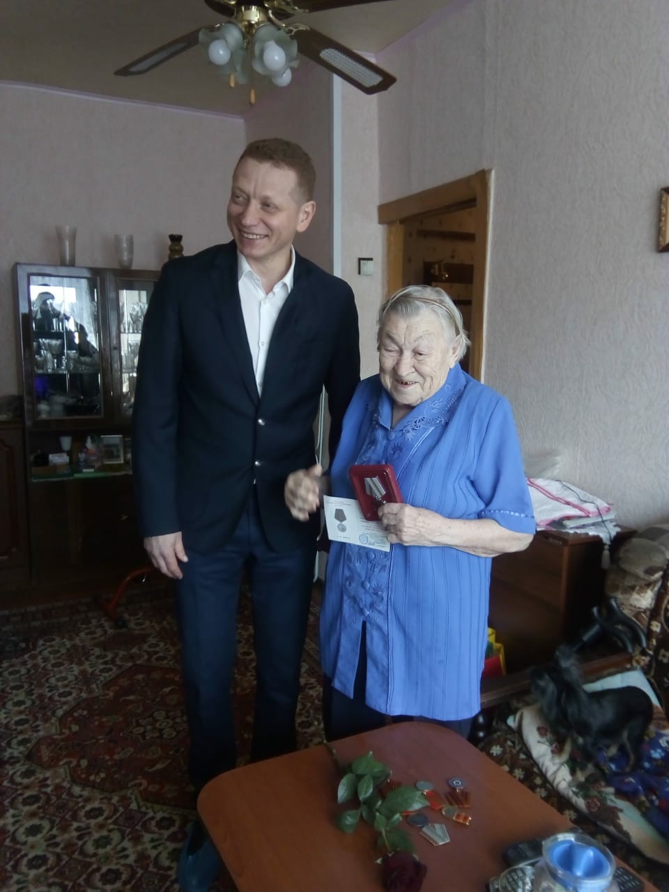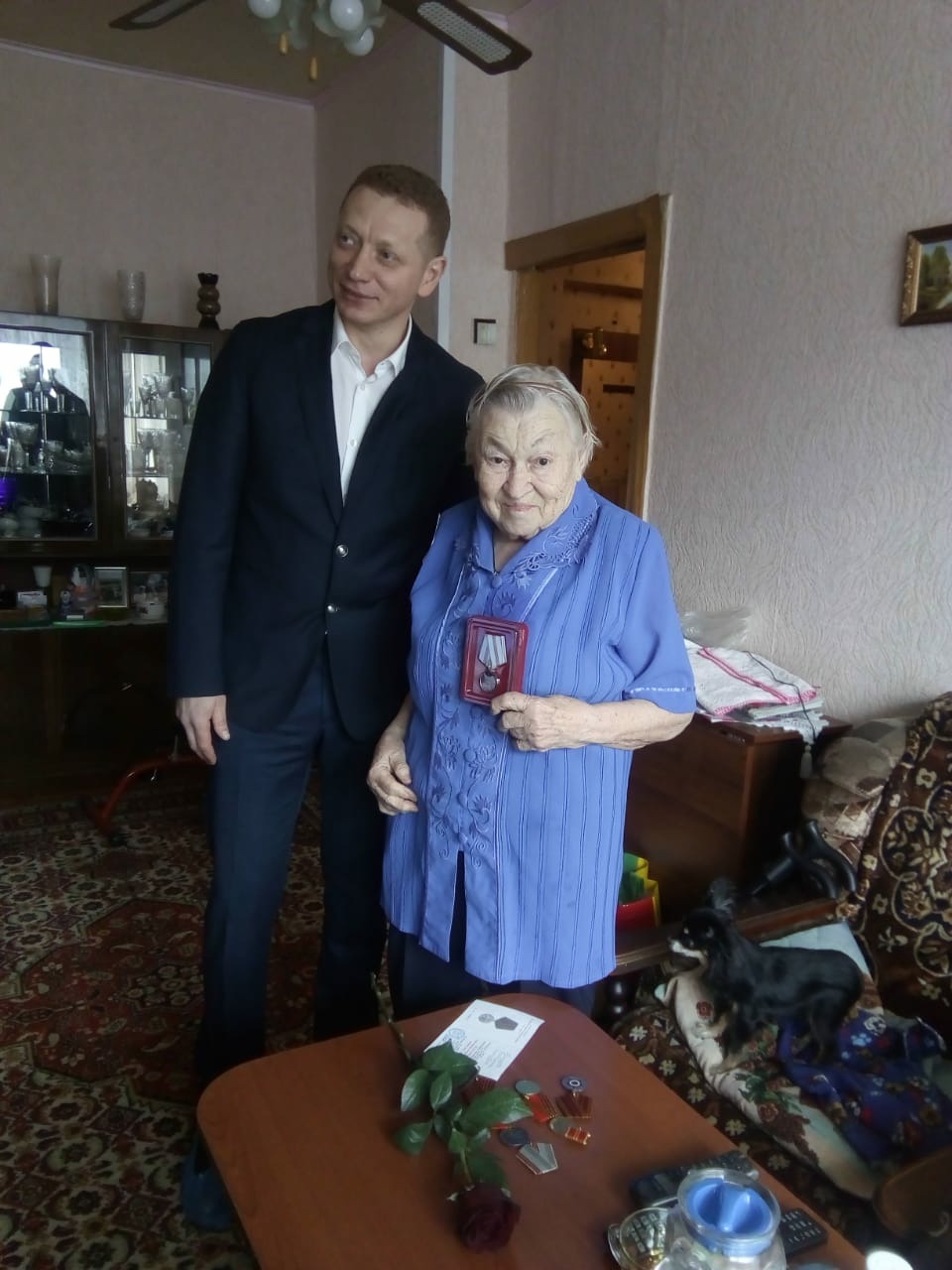 На фото: получательнице социальных услуг Управления «Ногинск» Комаровой Екатерине Семеновне вручает юбилейную медалью «75 лет Победы в Великой Отечественной войне 1941-1945 гг.» депутат Совета депутатов Богородского городского округа Жулябин Сергей Геннадьевич.