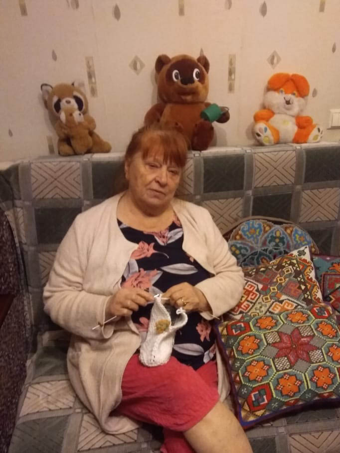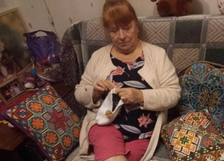 На фото: получательница Управления «Серпухов» Благовисная Александра Ивановна за рукоделием на фоне своих творческих работ.